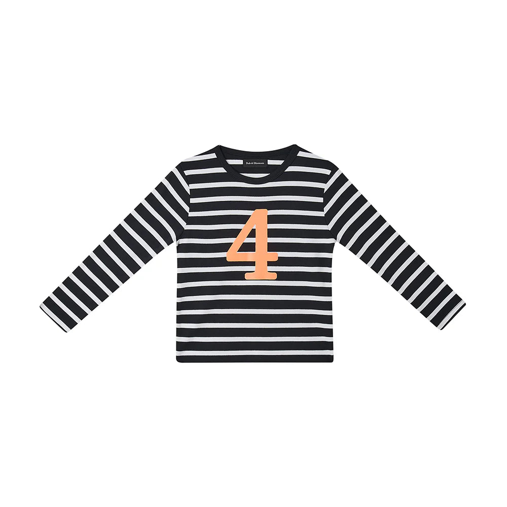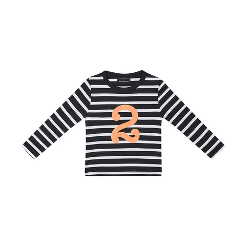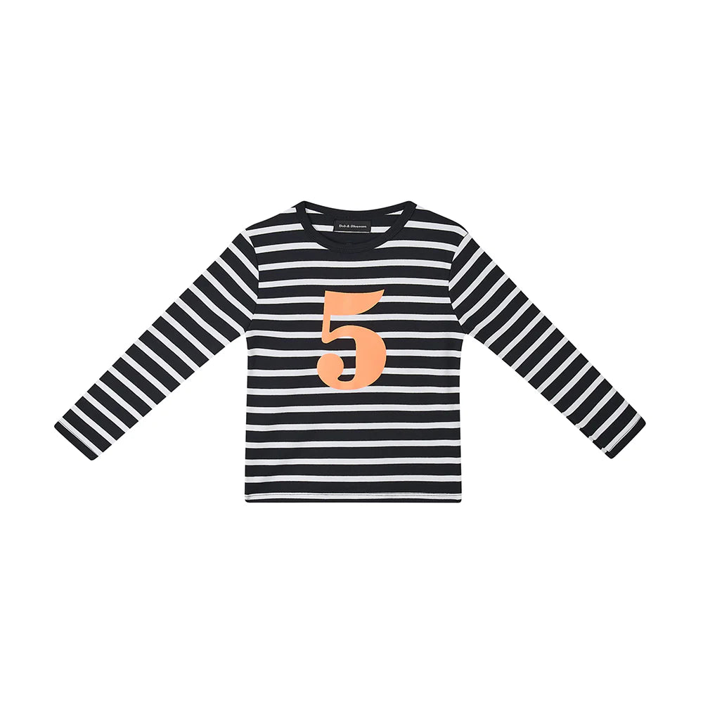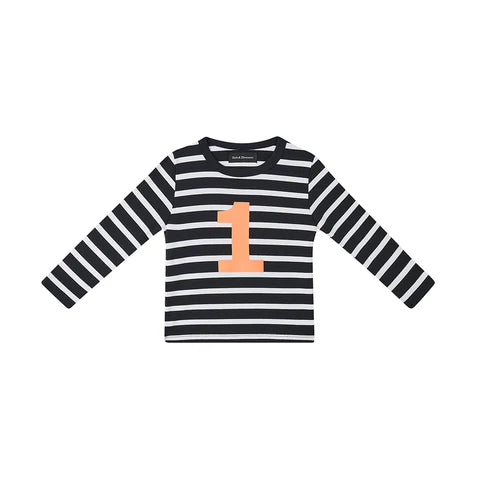 Black & white breton striped cotton T shirt, featuring an orange number 1-5 screen print. Long Sleeves only. See the whole collection here.