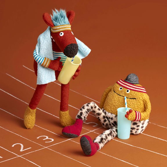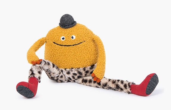 Say hello to Mouni, the delightfully dapper and delightfully loopy member of Moulin Roty’s Les Schmouks! Dressed in cheerful mustard-yellow fur, Mouni stands 50 cm tall with extra-long legs in cream fur trousers dotted with playful brown polka dots.