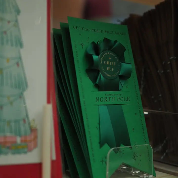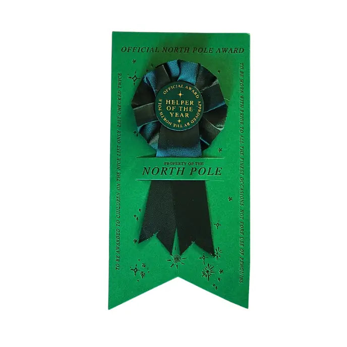 A must have piece for Christmas 2025! Backed on a letter press printed and die cut card for ease of gifting and display. Mini sized rosette with gold foil printing. Each roseete has a saftey pin backing. Not suitable for under 3 years. Available in two options - Chief elf or Helper of the year. Check out our matching nice list rosette too!