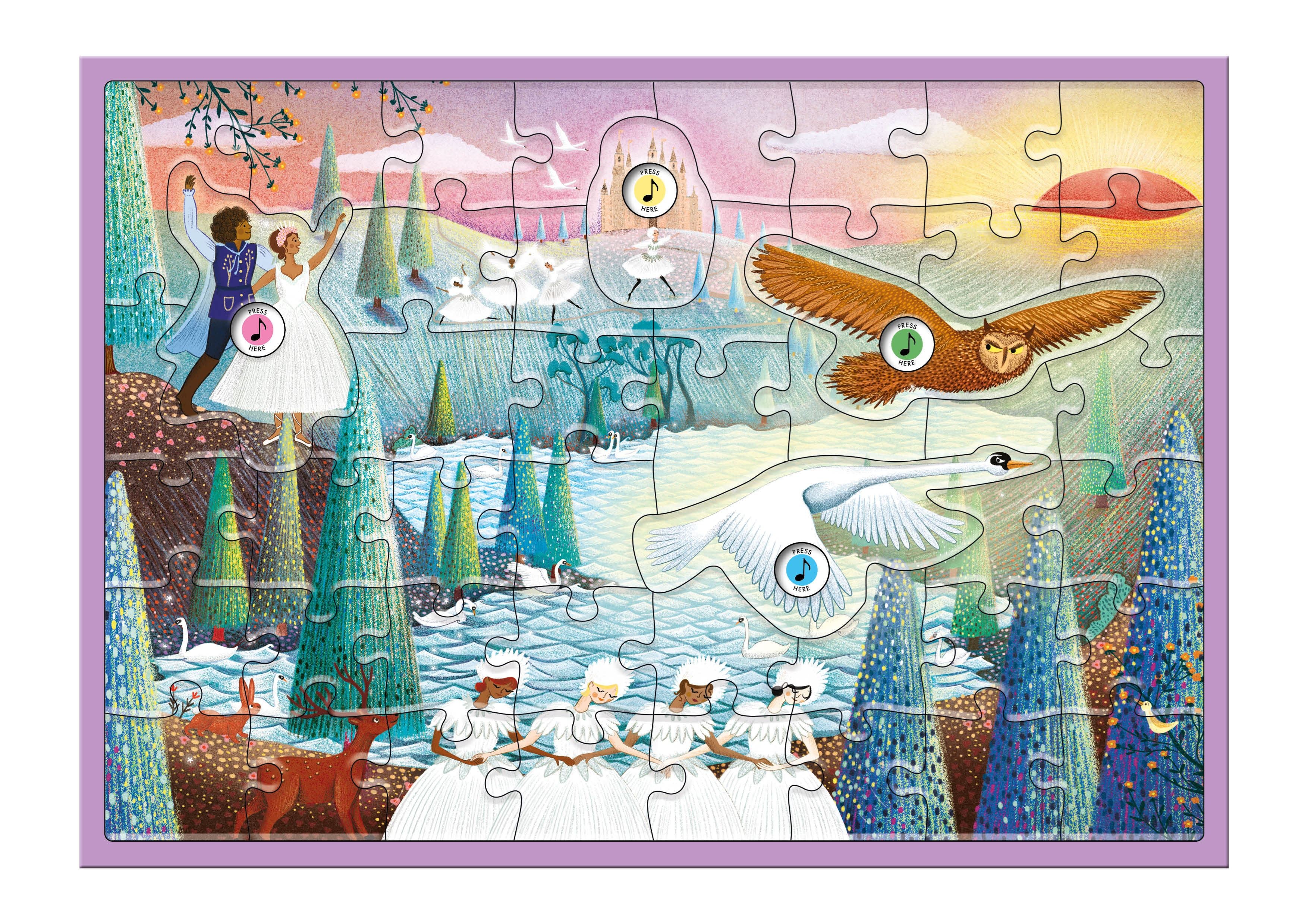 This 48-piece Swan Lake Musical Jigsaw Puzzle features four 10-second sound clips of an orchestra playing from Tchaikovsky's original score. Includes four special shaped pieces plus an educational poster featuring an abridged retelling of the story and information about the music and the composer.