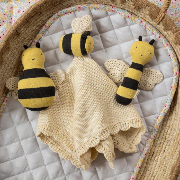 Soft on delicate skin and kind to the planet, our Buzzing Bee Rattle makes a thoughtful keepsake for newborns. Pair with our Knitted Little Hands Toys and Cuddle Cloths for a charming matching set.