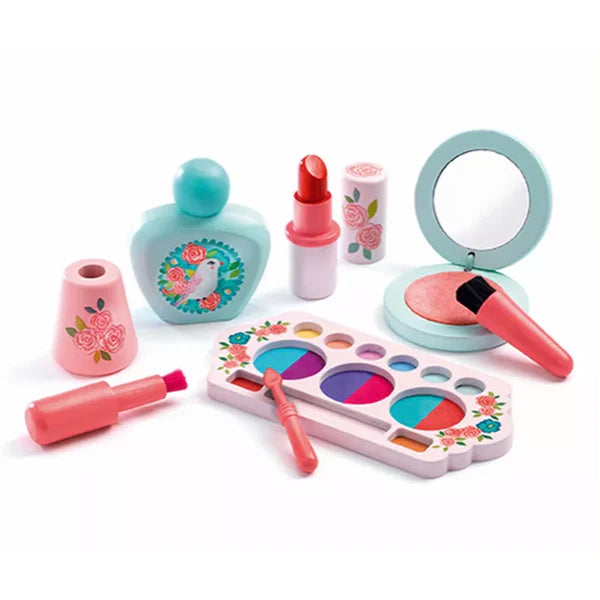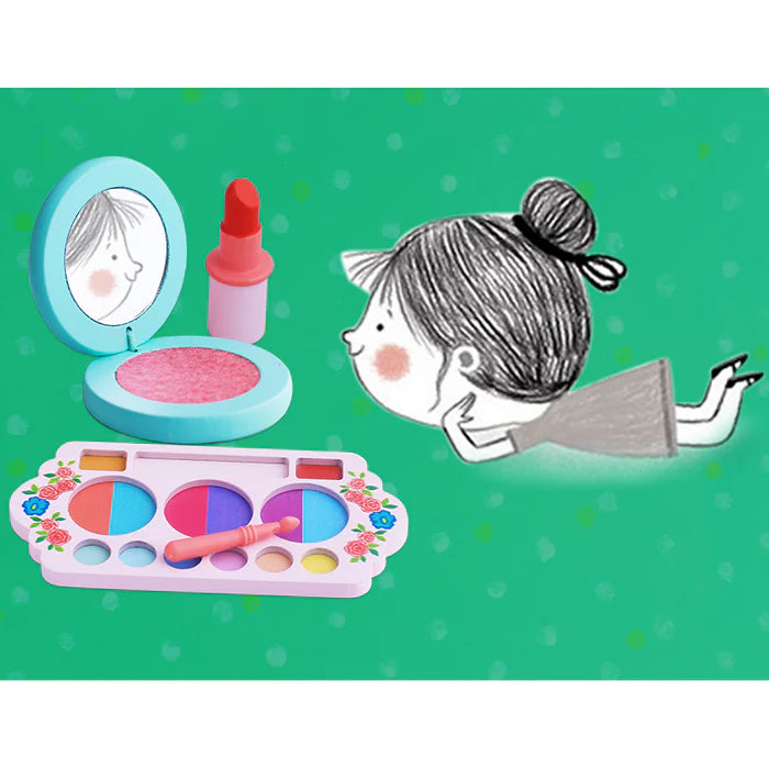 Unleash creativity and style with the Djeco Elodies Make-Up role-play set. This beautiful set includes pretend toy versions of lipstick, nail polish, a blush compact, eyeshadow palette, mirror and perfume—all designed for safe, imaginative dress-up fun.