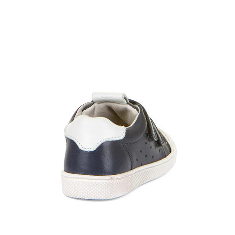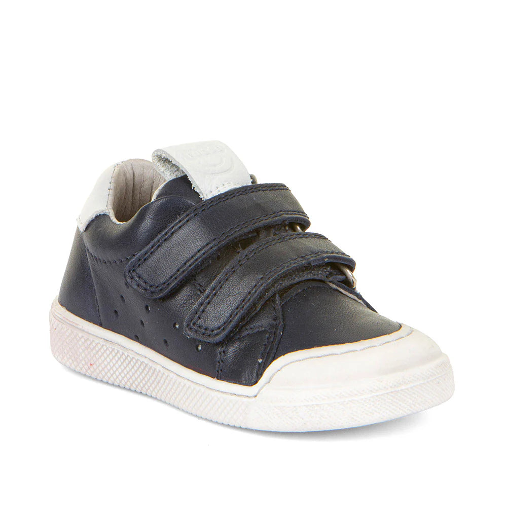 Froddo leather upper shoe with double velcro fastening straps. Flexible sole with rubber bumper toe protection. This style tends to run narrow.