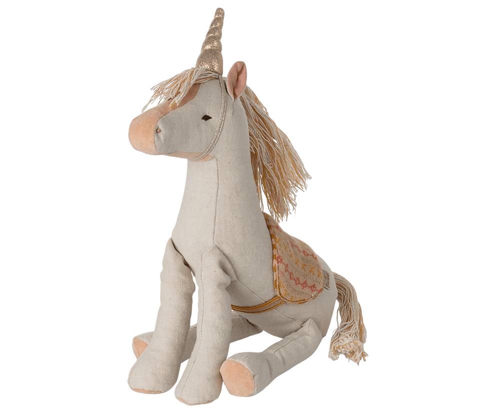 Let the magic unfold with this delightful medium-sized unicorn from Maileg, crafted in vibrant colors and topped with a shimmering golden horn. Perfect for sparking imagination, this charming unicorn invites endless adventures and fairy-tale journeys. It comes with a cozy saddle, making every ride comfortable and fun. Each unicorn is unique, with fabric patterns that may vary, adding a special touch to your magical companion. Ideal for playtime or as a whimsical decoration, this unicorn brings a sprinkle of enchantment to any day.