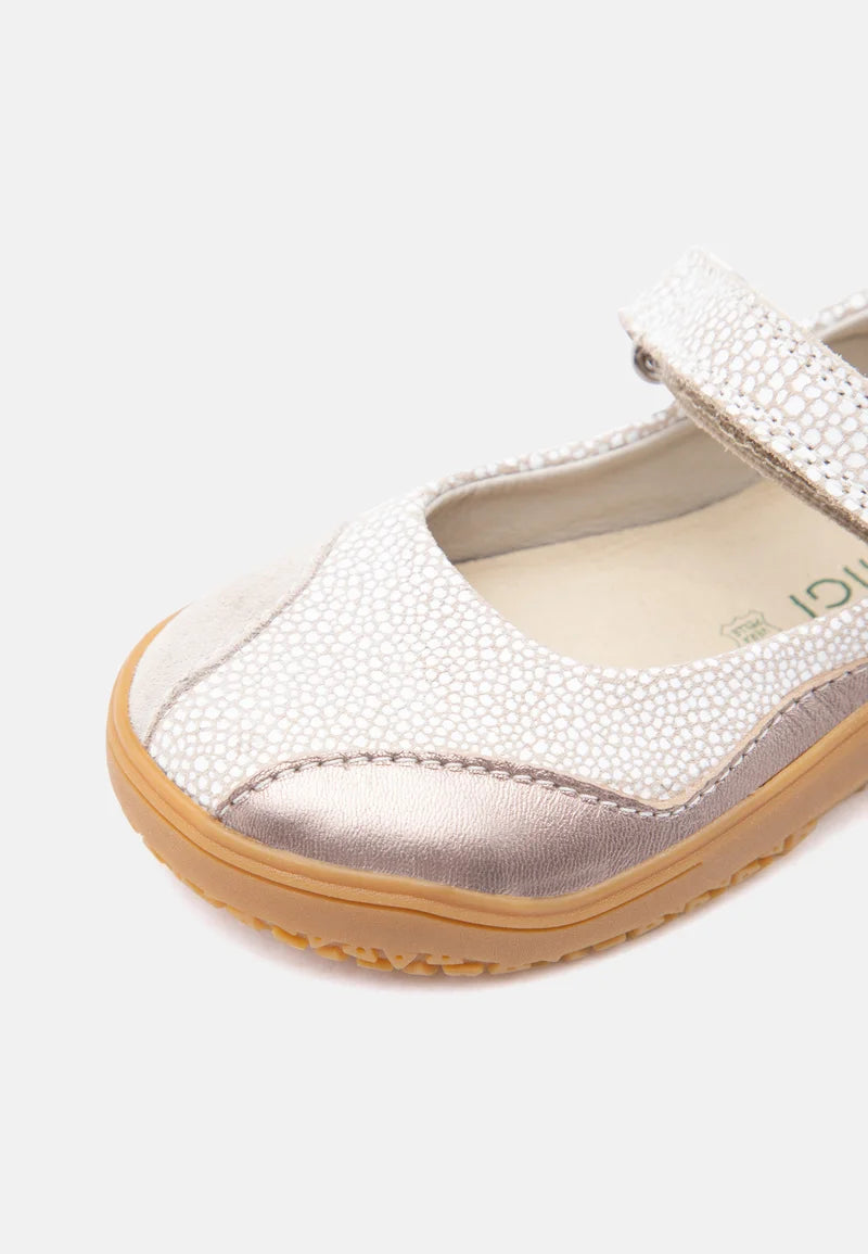 Introducing the Primigi Metallic Mary Jane in Barefoot style – a charming shoe designed for little feet. Crafted with a supple leather upper and microfiber lining, this shoe offers comfort and durability. The abrasion-proof rubber sole withstands everyday wear, whilst cold padding provides gentle cushioning. The synthetic insole supports natural foot development. Perfect for school or special occasions, this metallic Mary Jane combines classic style with practical barefoot design. Treat with a suitable protector before wear to maintain its finish.
