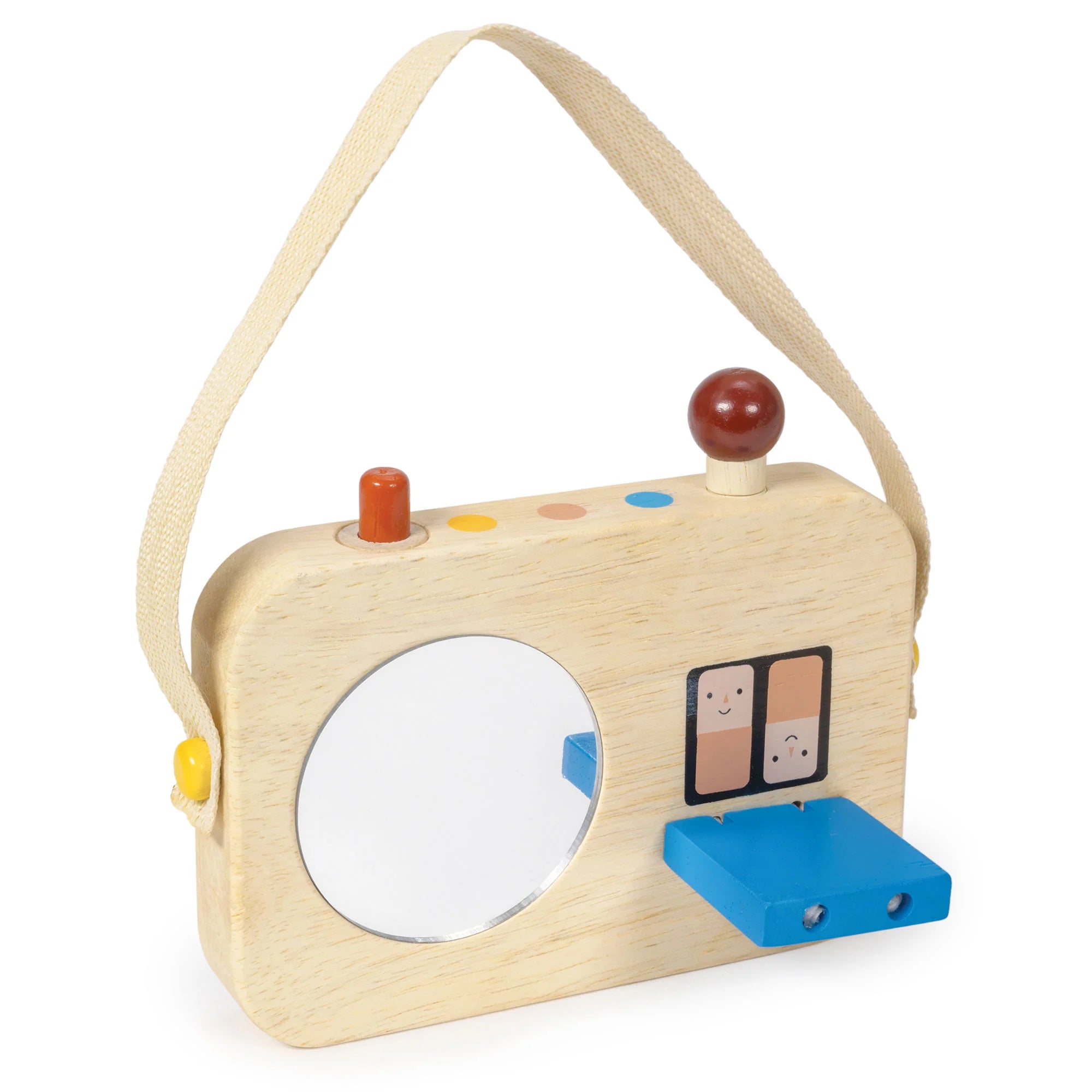 A retro style radio for toddlers exploring the cause and effect. A spinning dial with illustrations, a clacking face button, and a sliding red knob to delight a little one. On the reverse is a mirror and a blue flap revealing 2 friendly batteries. An elasticated knob and a push button along the top complete this simple busy board.