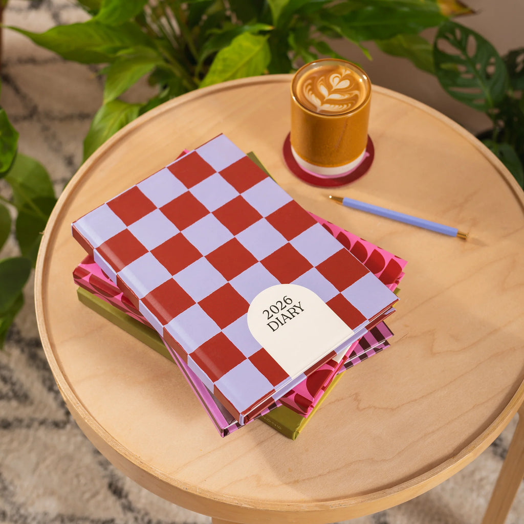 Make a statement with the Blue Berry 2026 Diary, featuring a wavy checkerboard cover in vibrant berry red and soft periwinkle. Structured yet playful, a little retro and a touch rebellious, this diary is made for planners with personality who want to stay organised in style.