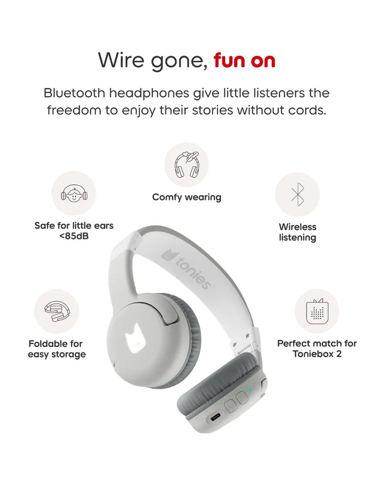 These Moon Grey Bluetooth® Headphones pair with Toniebox 2 for safe, comfy listening. With fun LED lights and up to 40 hours of play, it’s Toniebox listening, with room to roam. Go wireless with these Moon Grey Bluetooth® Headphones, the perfect match for Toniebox 2. With easy NFC pairing, little listeners can enjoy up to 40 hours of wireless playtime. Designed with growing kids in mind, they feature a comfy adjustable fit, playful LED lights, and a safe volume limit of 85dB.
