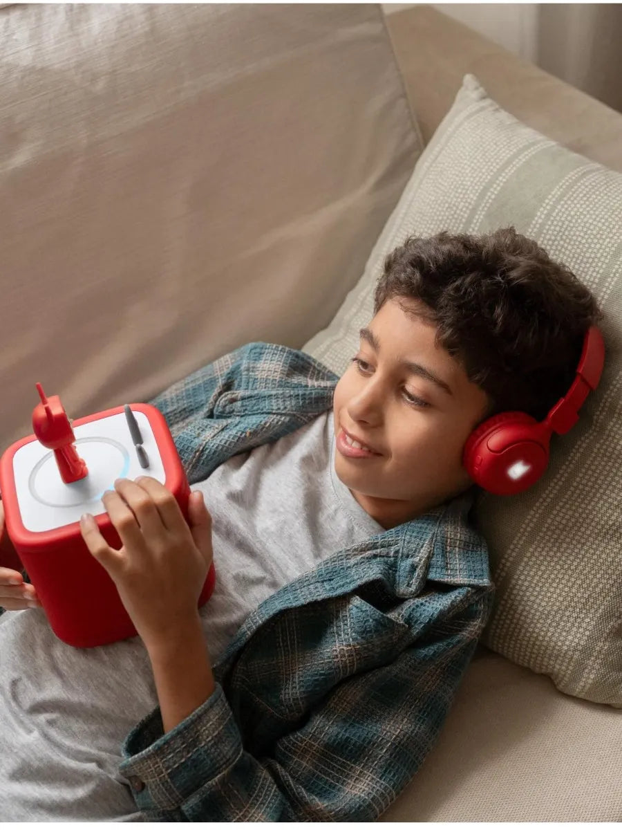 These Sunset Red Bluetooth® Headphones pair with Toniebox 2 for safe, comfy listening. With fun LED lights and up to 40 hours of play, it’s Toniebox listening, with room to roam. Go wireless with these Sunset Red Bluetooth® Headphones, the perfect match for Toniebox 2. With easy NFC pairing, little listeners can enjoy up to 40 hours of wireless playtime. Designed with growing kids in mind, they feature a comfy adjustable fit, playful LED lights, and a safe volume limit of 85dB.