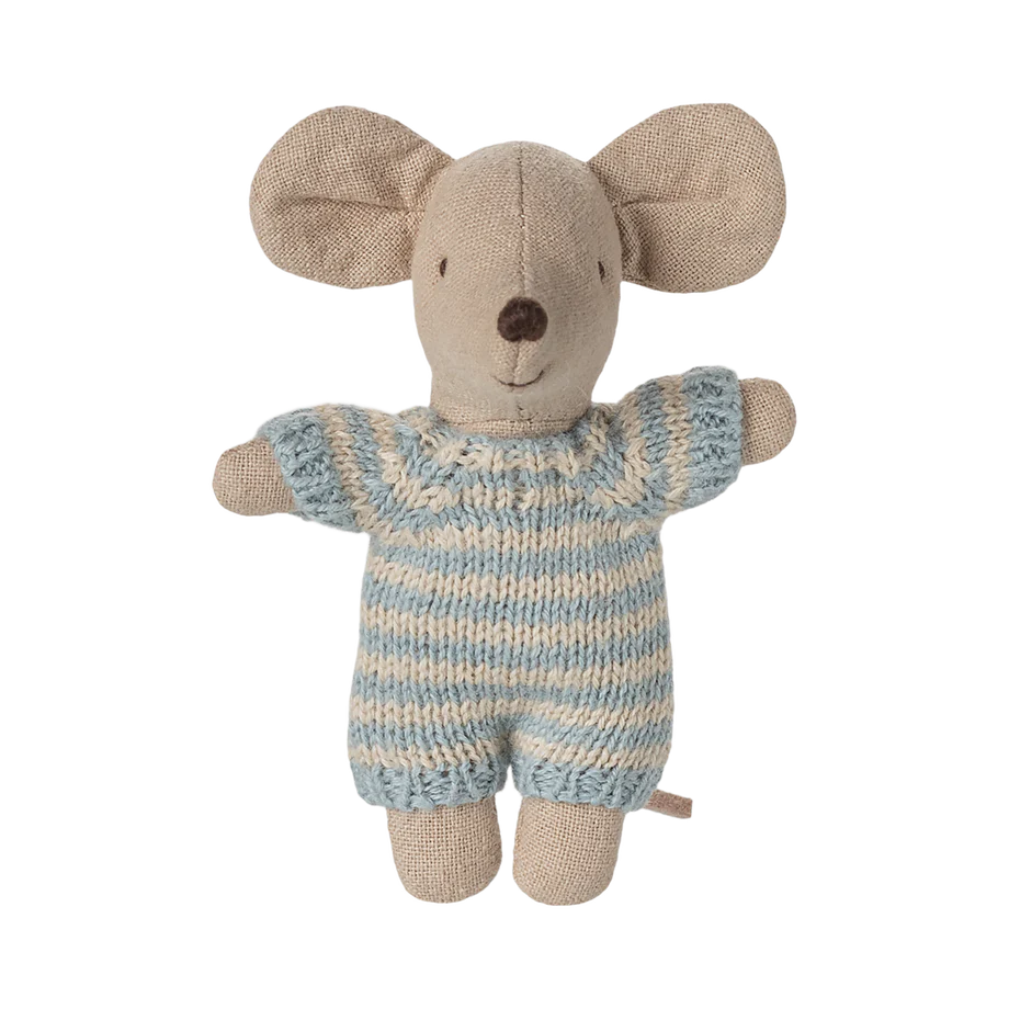 Meet the tiniest and most adorable addition to the Maileg family — the Maileg Baby Mouse in Carry Cot – Blue. This sweet baby mouse is tucked up snugly in a soft, quilted carry cot, complete with a striped mattress, knitted blanket, and matching blue outfit for the cosiest naps and adventures.
