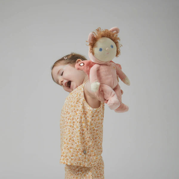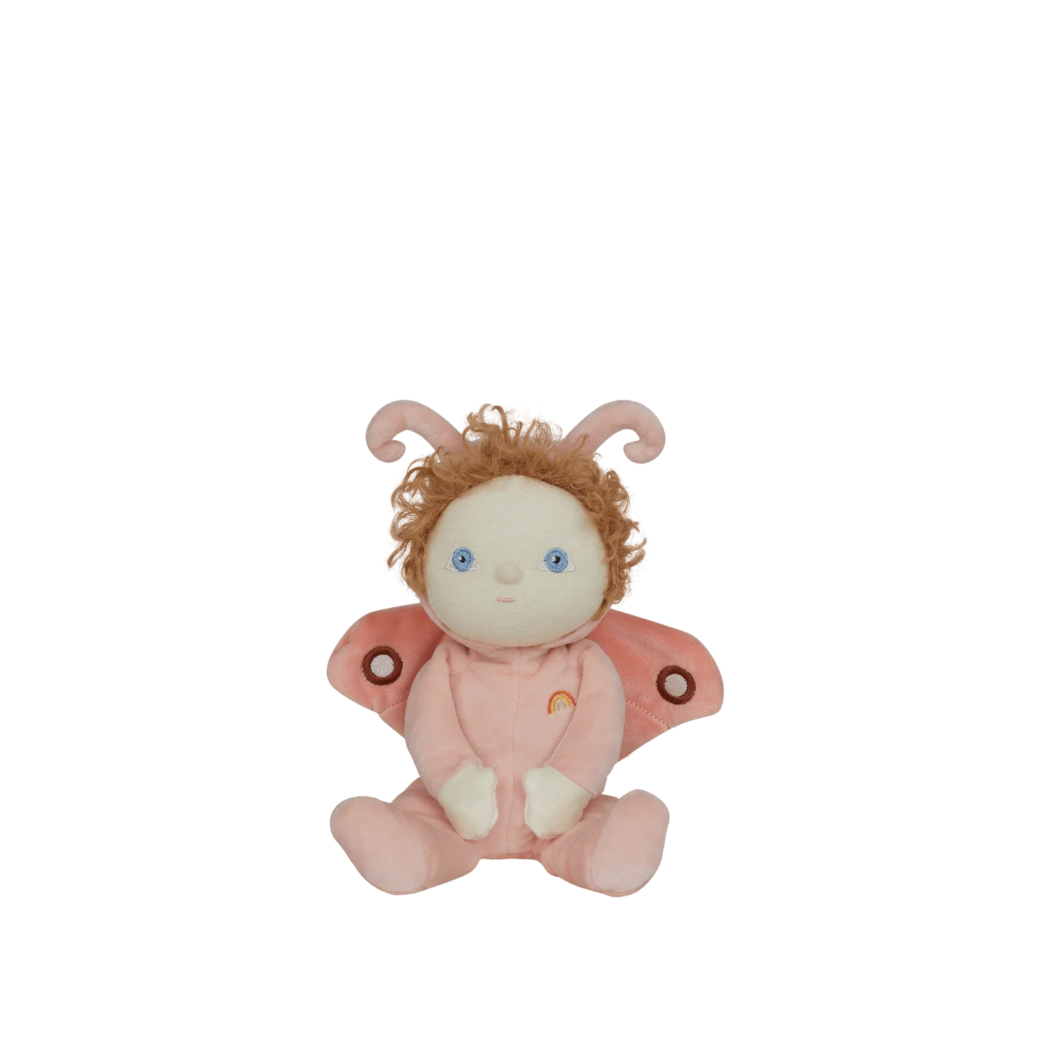 Dressed in a peachy-pink velvety suit with fluttery embroidered wings, a cosy hood with dainty antennae, and a head of gorgeous ginger curls, Millie is made for cuddle-time and starlit storytelling. With the sweetest blue eyes that sparkle like moonlight, she’s as dreamy as they come.