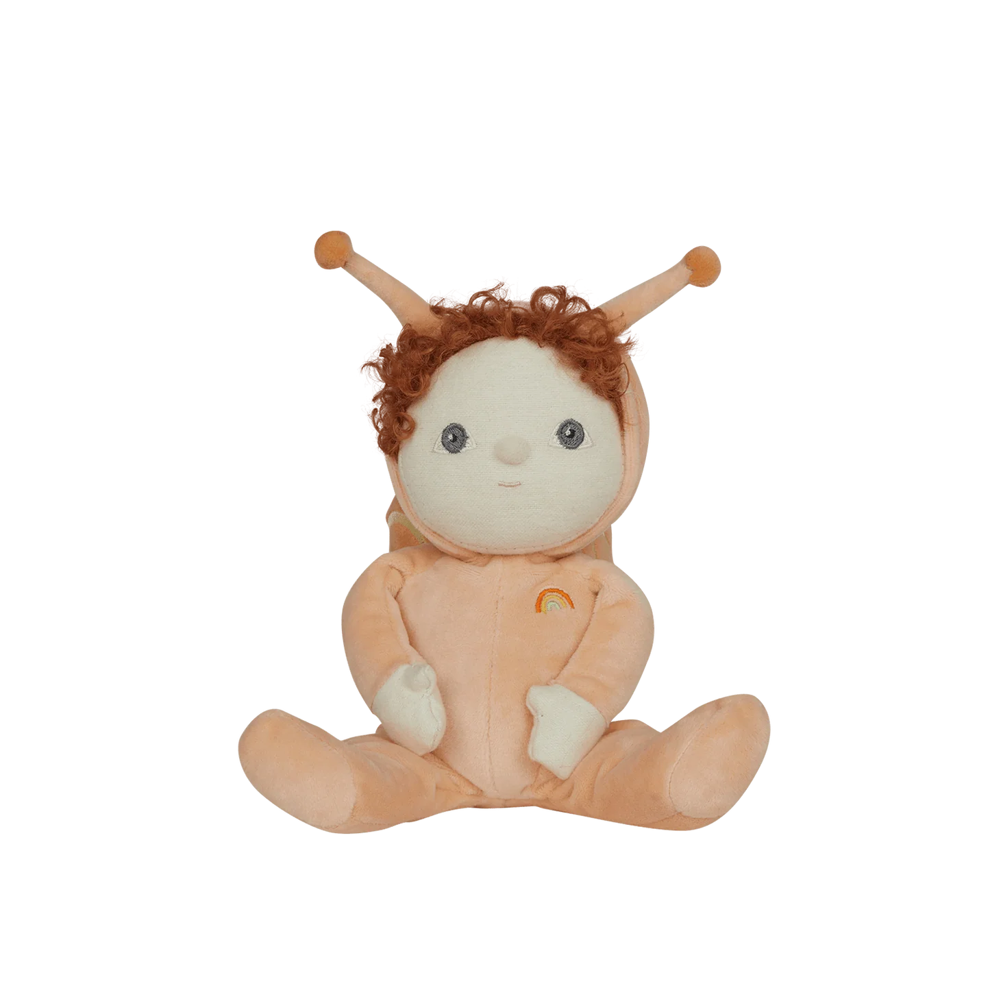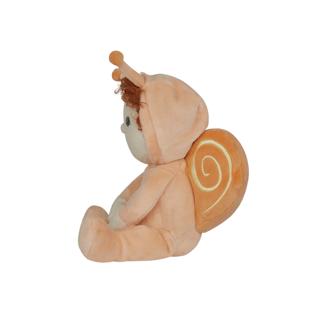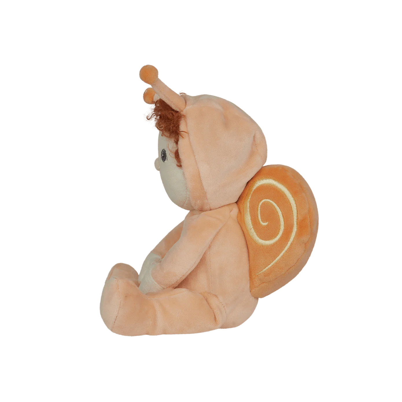 In a soft, velvety orange jumpsuit with matching hood and antennae, Scottie is the epitome of warmth and comfort. Rich, fiery orange curls and ashy hazel eyes are a soft contrast to the big, swirling snail shell on his back, which boasts a delightful yellow embroidery. With a gentle presence and laid-back style, Scottie is the perfect companion for little ones who love to slow down, snuggle, and enjoy the quiet moments.