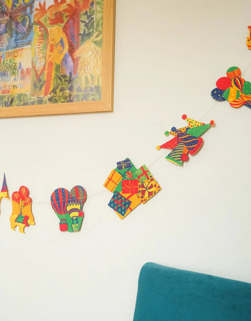 A parade of whimsical shapes, bursting with balloons, colour, and birthday cheer are strung along this three metre celebration garland.