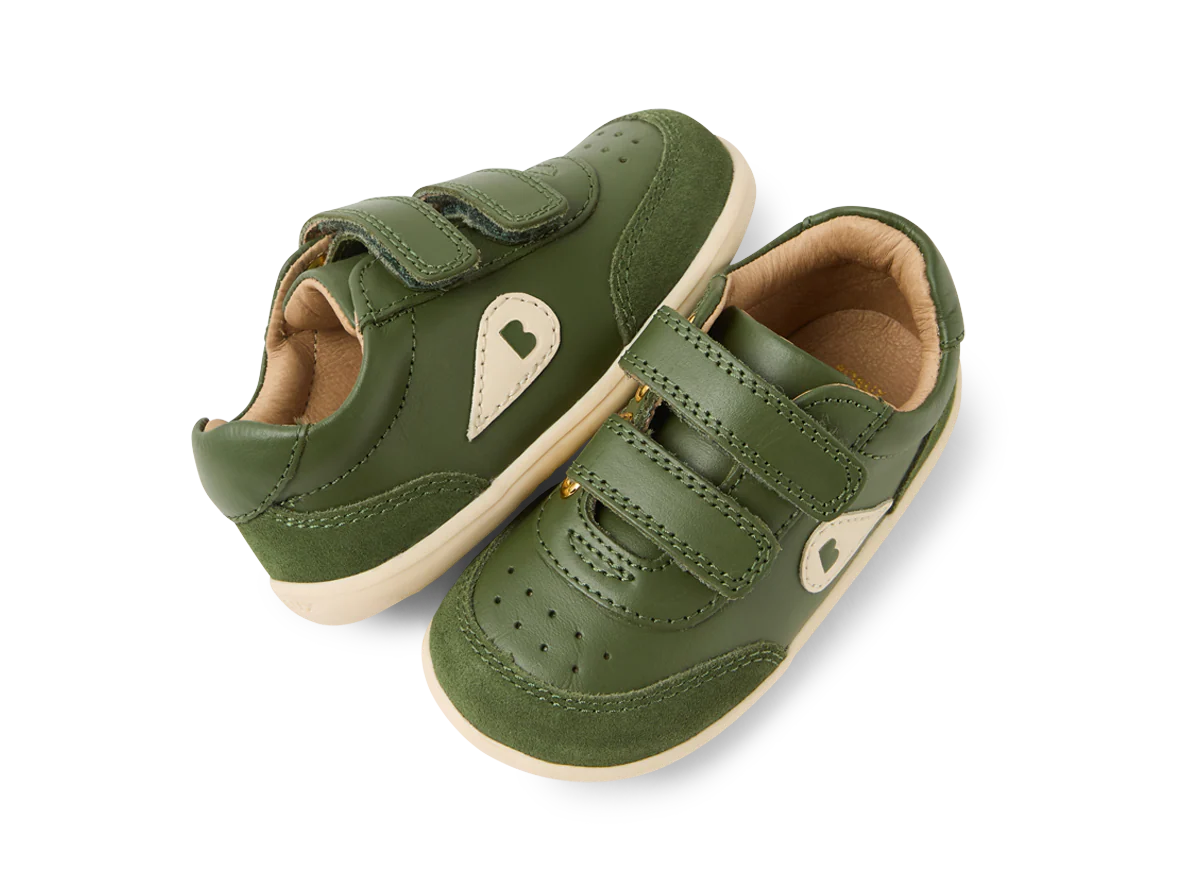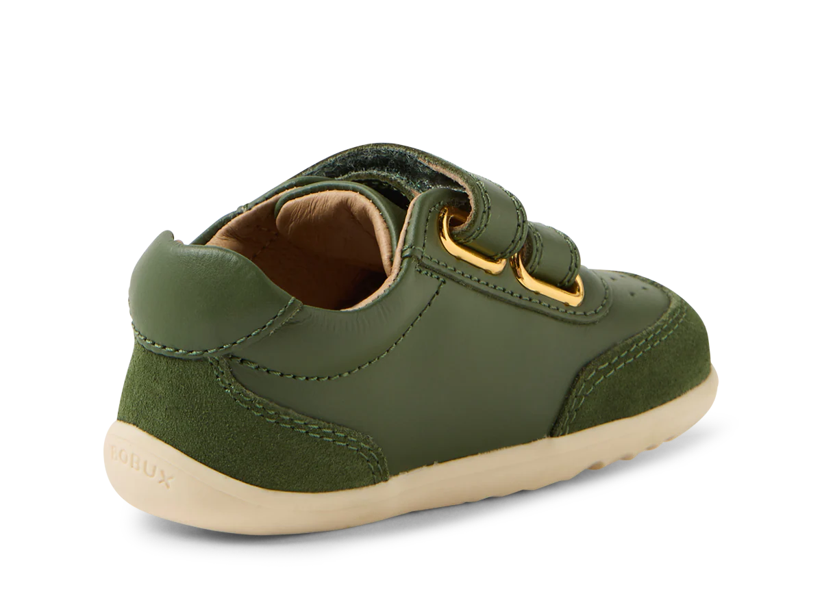 Give your child the freedom to explore with the Bobux step-up Champ Bronze Green sneakers. Built from premium leather and suede, these trainers combine style with practical support for growing feet. The ankle support, padded collar, and dual adjustable straps work together to keep little ones secure and comfortable during all their adventures—whether they're running, jumping, or discovering the world around them.