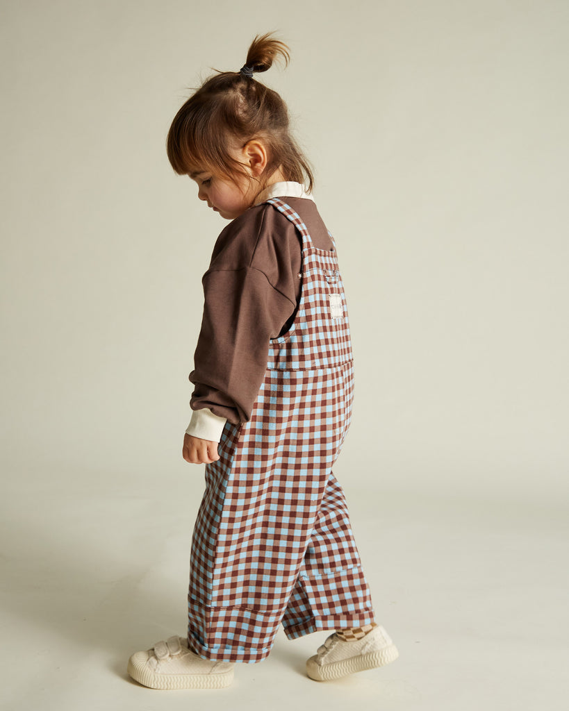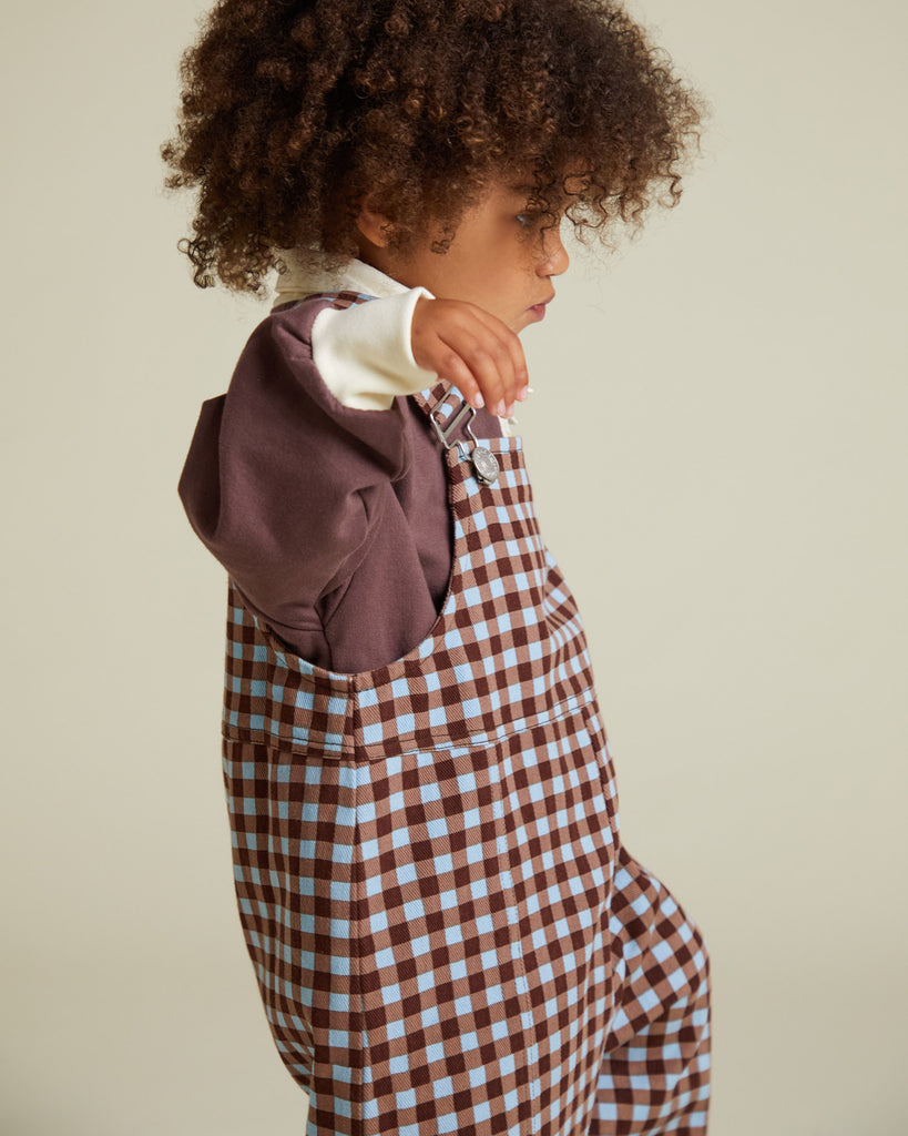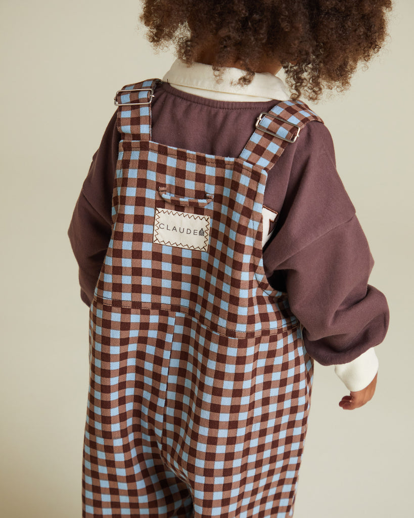 A fresh addition to our playful prints, the August Sky Gingham Dungaree reimagines our signature oversized, slouchy fit in a balloon-leg shape that’s perfect for rolling up. Made in India from 100% GOTS organic cotton, it features panel detailing on the front and back with contrast stitching and an oversized Claude & Co label on the back. Silver metal adjustable buckle fastenings and straps ensure the perfect fit, while an upper-back tab adds extra detail. Sizes 3-6 months and 6-12 months feature a discreet leg-popper fastening for ease during nappy changes. Finished in a rich chocolate brown and sky gingham pattern, this versatile dungaree is a stylish addition to any little one’s wardrobe.