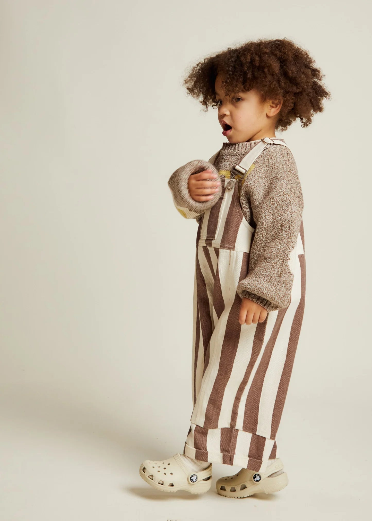 Our iconic Blythe dungaree returns in a classic stripe print. Crafted from 100% organic cotton twill. Cut with a relaxed silhouette. Panel detailing on the front and back with oversized front pocket and contrast stitching. Finished with adjustable buckle fastenings.