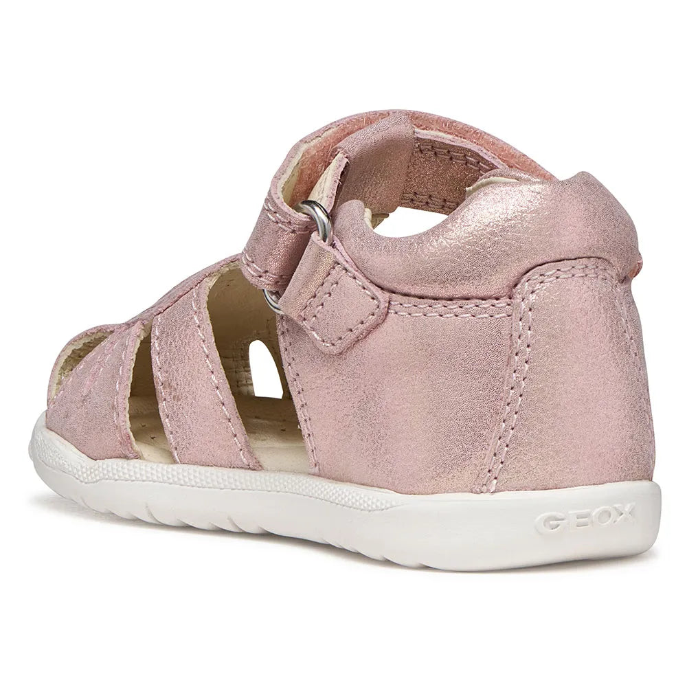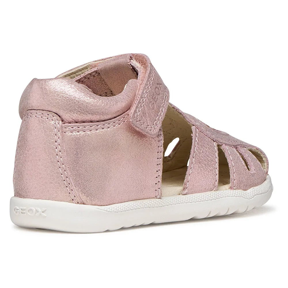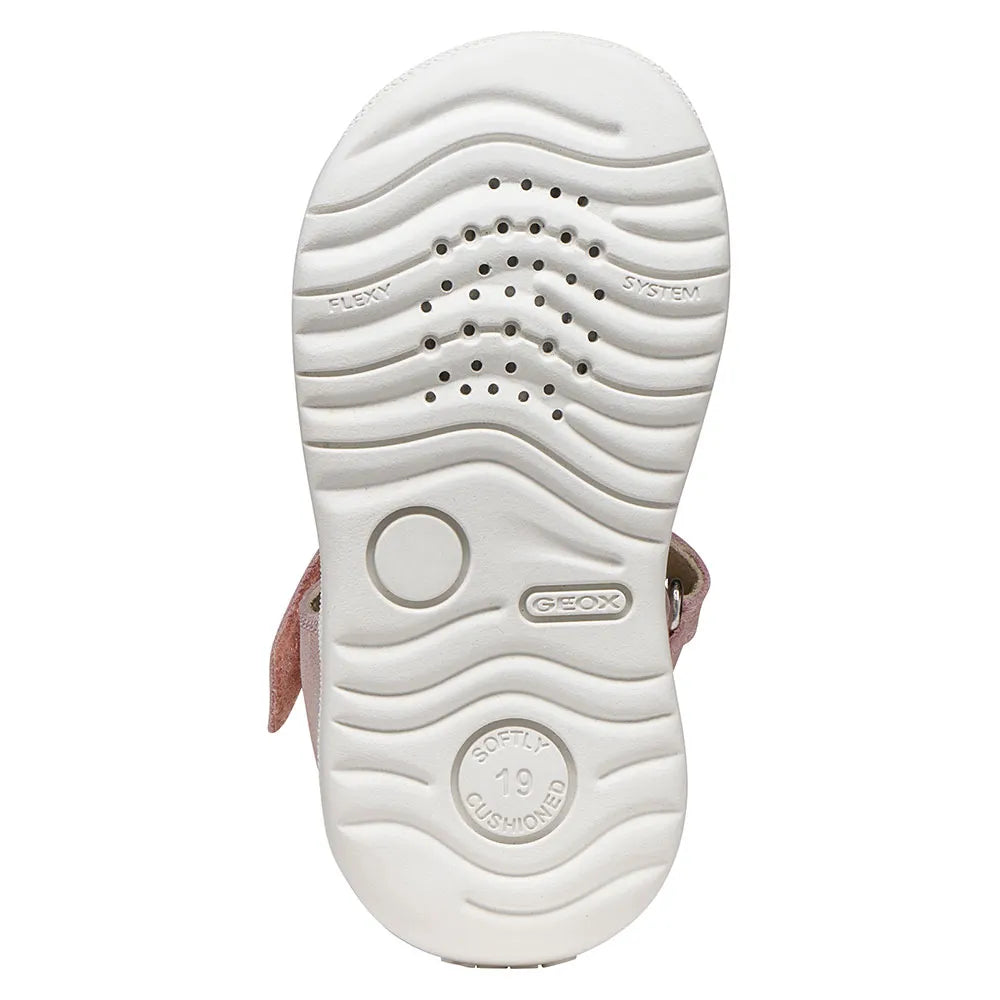 Geox Macchia Velcro Heart Sandal in Rose Glitter combines style with comfort for little feet. The eye-catching rose glitter upper features a charming heart detail and easy velcro fastening for quick on-and-off wear. Crafted with premium materials, these sandals feature a full grain sheep leather lining and insole for breathability and softness. The durable rubber outsole provides reliable grip and protection. The coated leather upper resists wear while maintaining flexibility. Perfect for warm days, these sandals offer the quality and durability Geox is known for, with a fun design that children will love.