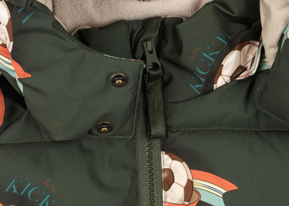 The Konges Sløjd Nuka Jacket – Green / Kick It is a warm and practical puffer jacket designed for ultimate weather protection while keeping little ones comfortable and stylish. Crafted with THERMOLITE® EcoMade padding, it provides lightweight insulation that locks in warmth without feeling heavy. The detachable hood, storm cuffs, and gentle water-repellent, wind-resistant finish ensure protection against the elements, while the breathable design (3000 g/m2/24h) prevents overheating during active play.