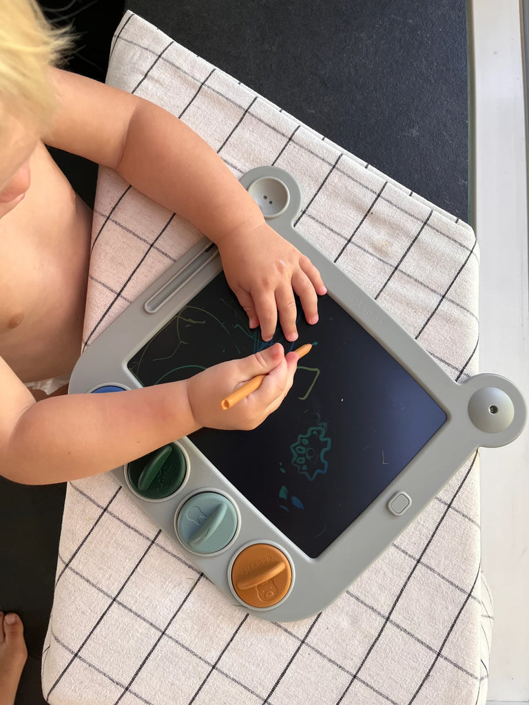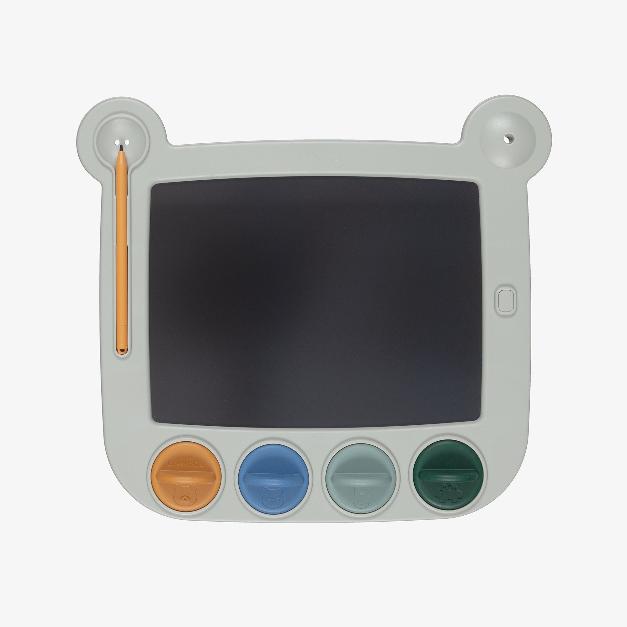 A bear-shaped LCD drawing board designed for endless creativity, complete with a pen and 4 fun silicone stamps. Lightweight and reusable, it features a screen lock for saving drawings, a simple erase button, and a secure pen holder — perfect for on-the-go imagination.