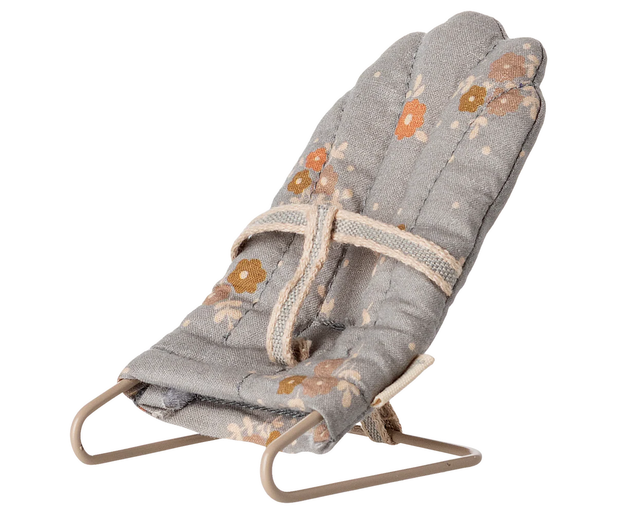 Keep your tiniest Maileg friends snug and cosy with the Maileg Babysitter in Blue, perfectly sized for My-sized rabbits, bunnies, and baby mice. This adorable miniature baby seat features a metal frame covered in soft, beautifully patterned fabric, making it both sturdy and stylish for your Maileg nursery setup.