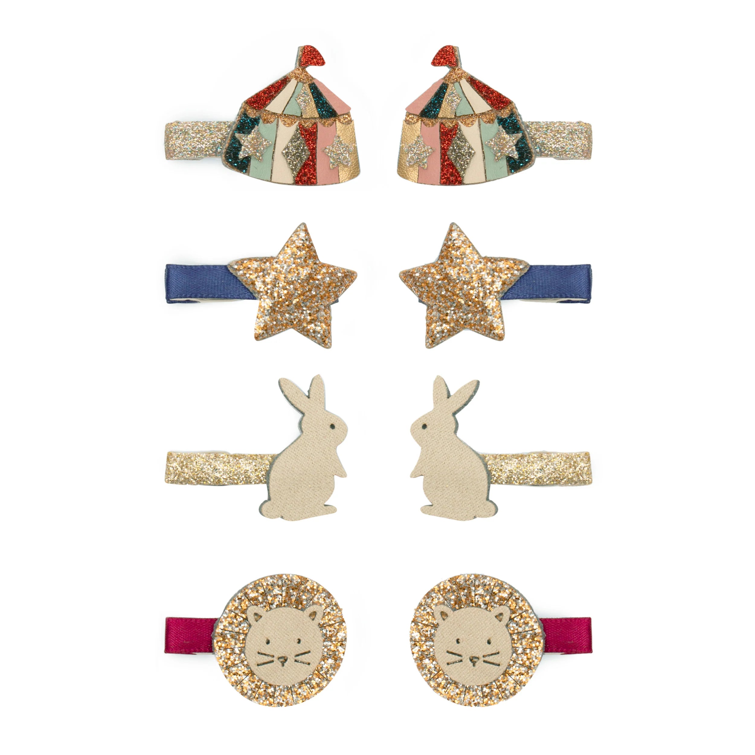 - Lions, circus tents, rabbits and stars crafted from a mix of glitter, metallic and soft suedette fabrics