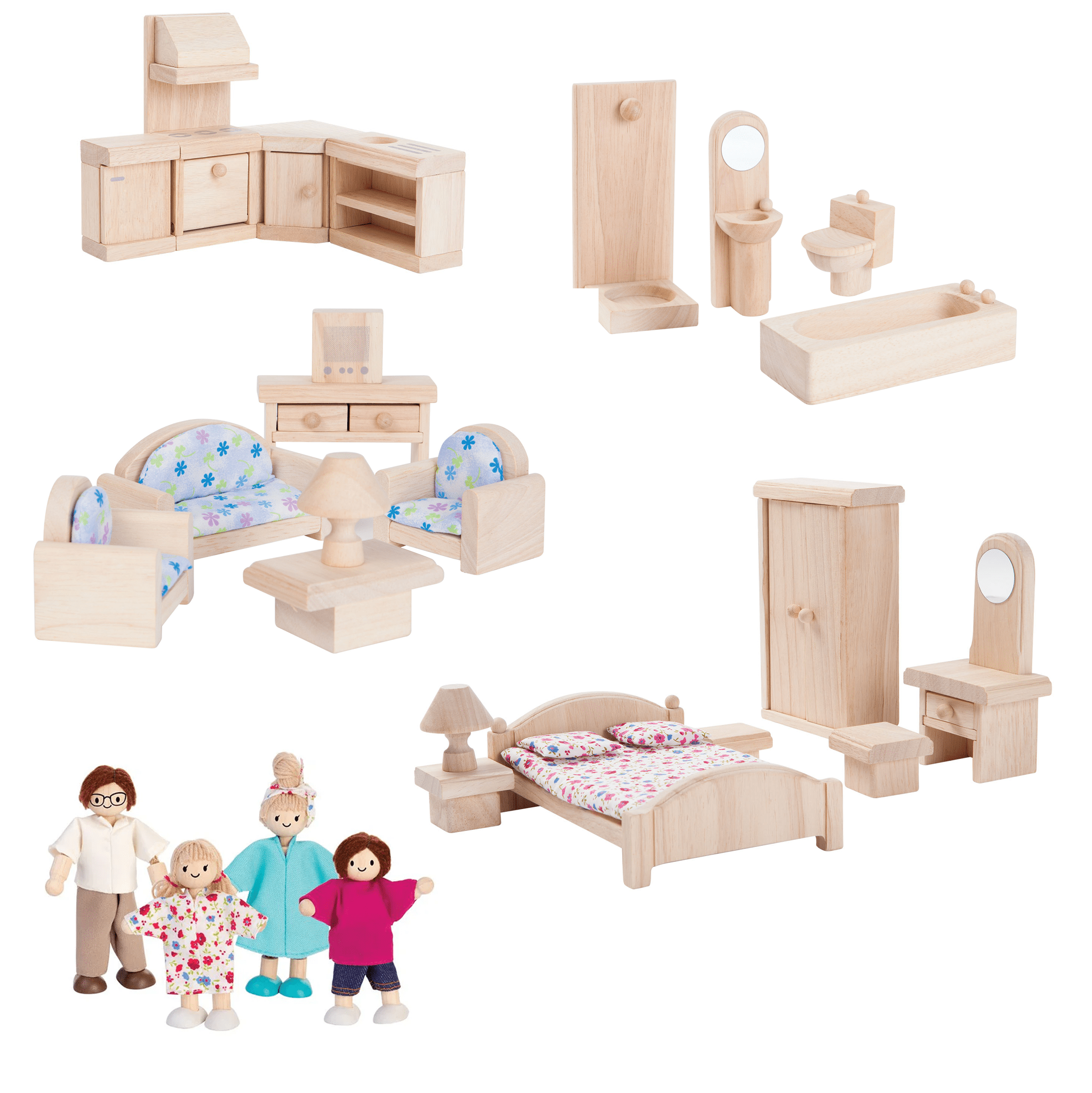 Bring your PlanToys Victorian Dollhouse to life with this beautifully crafted bundle of 4 classic wooden dollhouse furniture sets and a charming wooden doll family. Perfect for imaginative, open-ended play, this set includes: