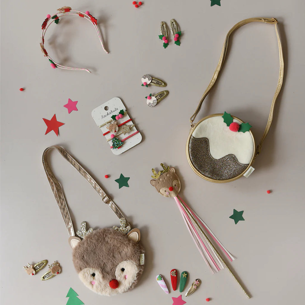 Bring some holiday cheer to every hairstyle with the Festive Christmas Ponies from Rockahula. This merry set includes four elastic hair ties featuring a glittering Christmas tree, a sparkling star, a bright red bow, and a jolly Santa. Perfect for parties, playdates, and Christmas morning fun.