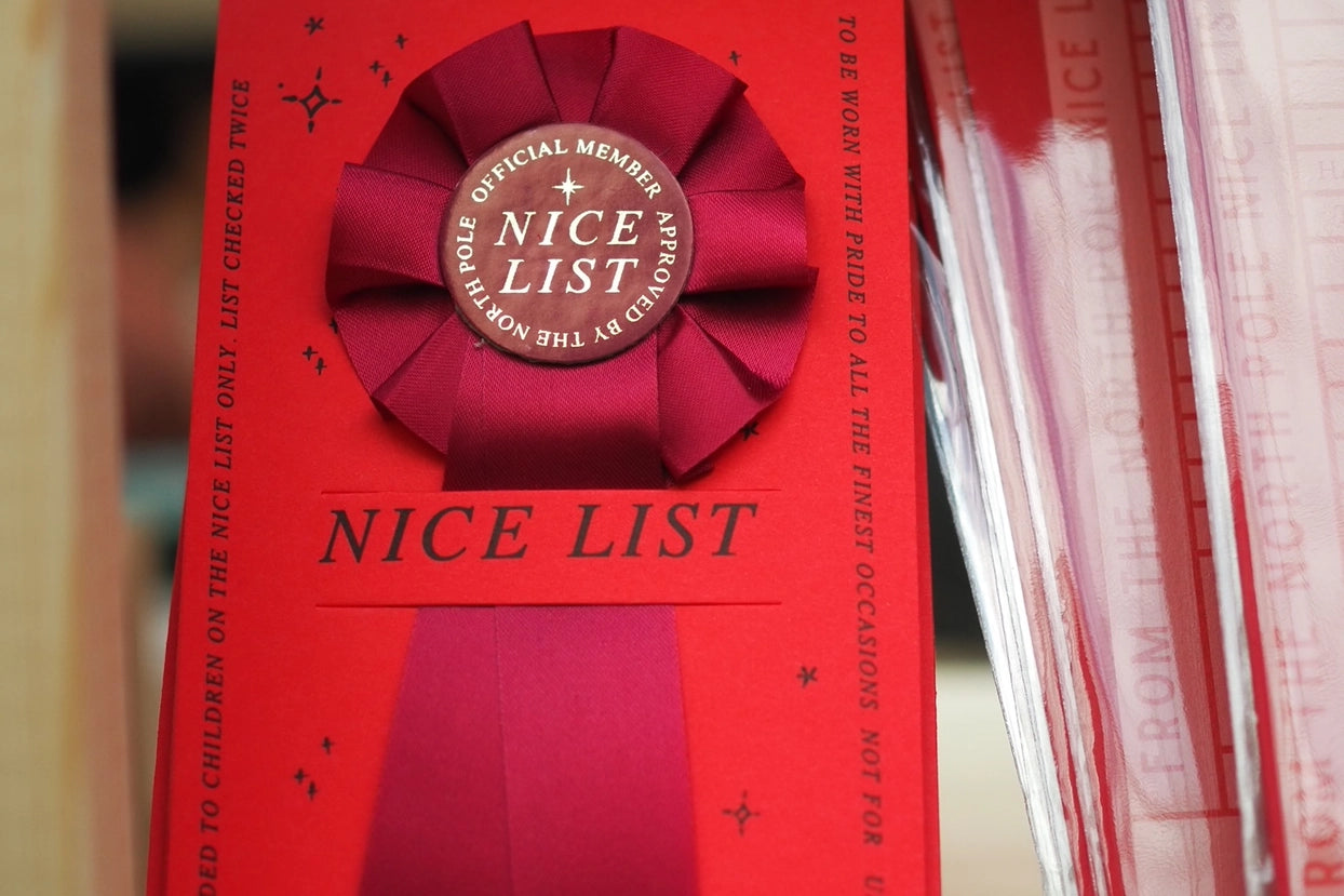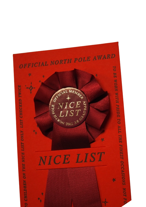 A must have piece for Christmas 2025! Backed on a letter press printed and die cut card for ease of gifting and display. Mini sized rosette with gold foil printing. Each roseete has a saftey pin backing. Not suitable for under 3 years.