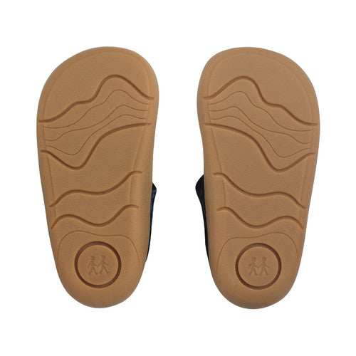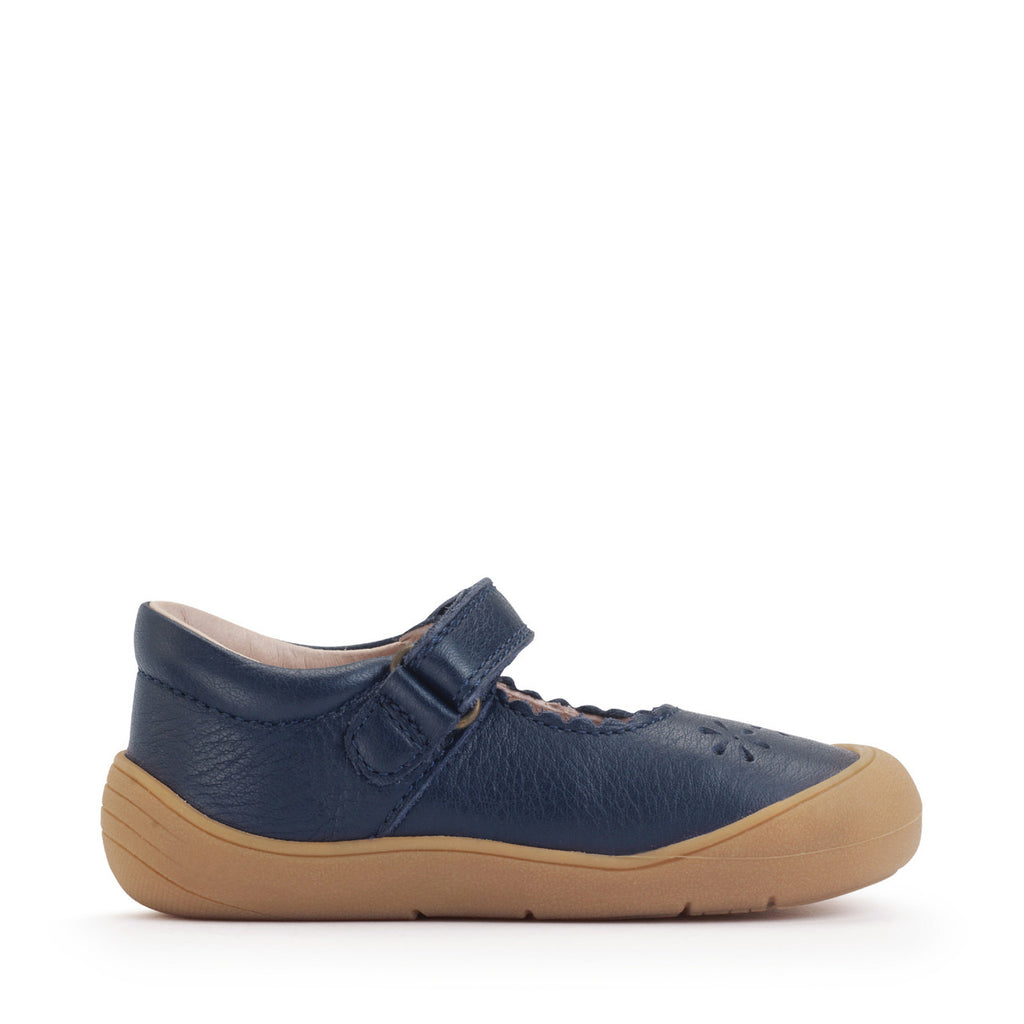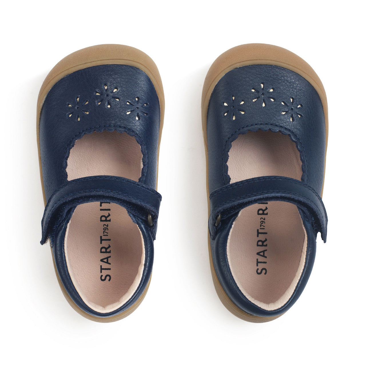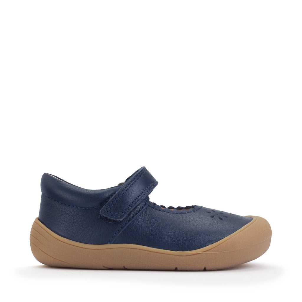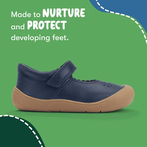 Our simple yet beautiful first walking shoe in stylish soft navy blue. Tentative first steps can be taken in confidence with these lightweight super flexible shoes. The floral punch detailing, scalloped edges and modern sole blend perfectly together. Scuff resistant heel and toe protection bumpers help shoes look good for longer.