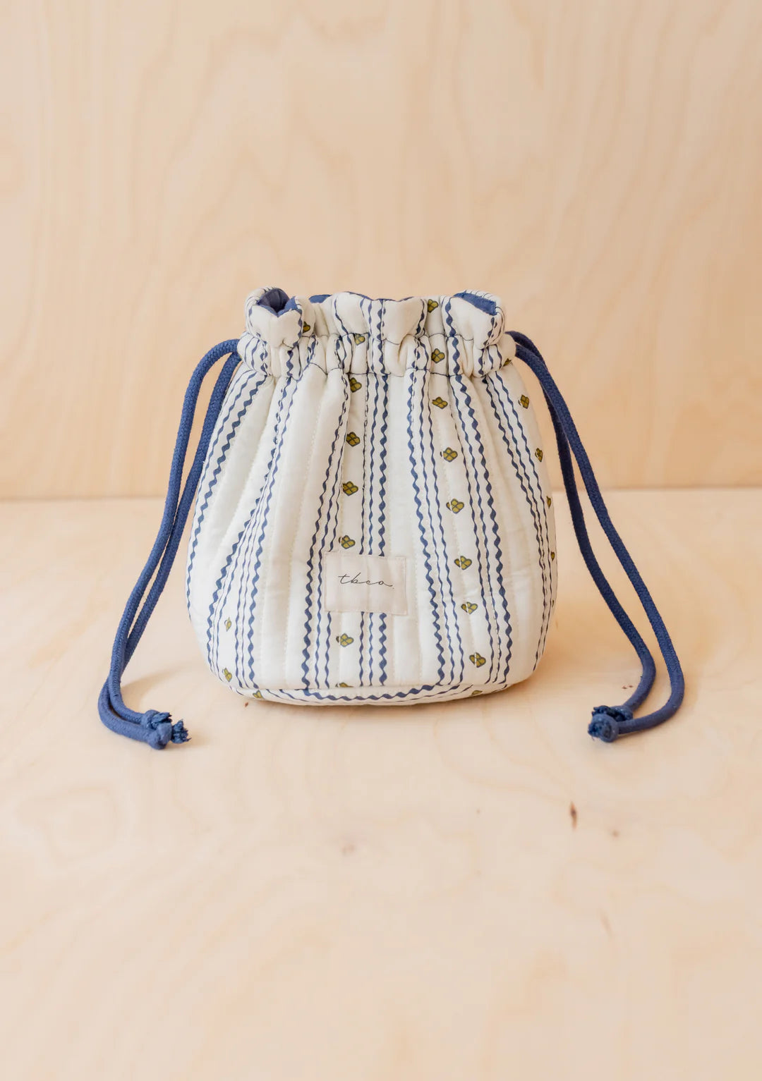 This structured 100% cotton quilted wash bag features 4 interior pockets and fastens with a drawstring top. Compact yet roomy, it stands upright and brings joy to daily rituals.
