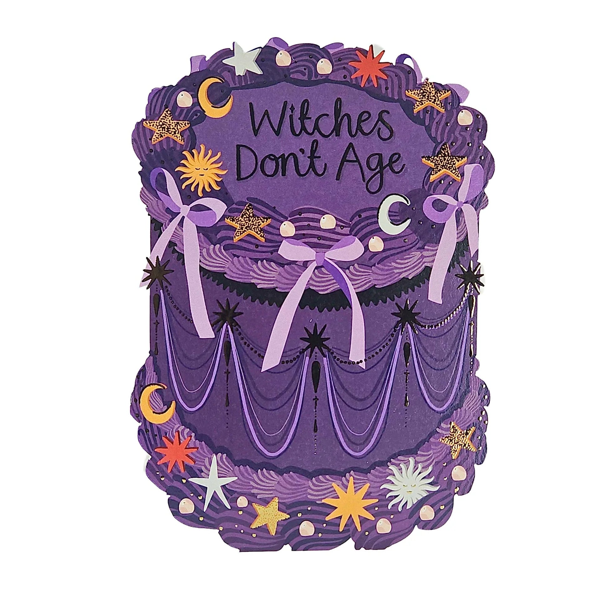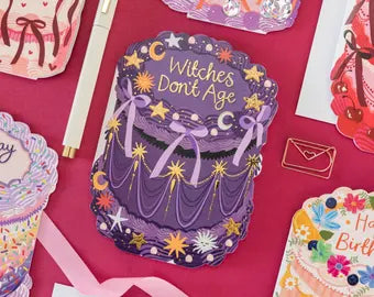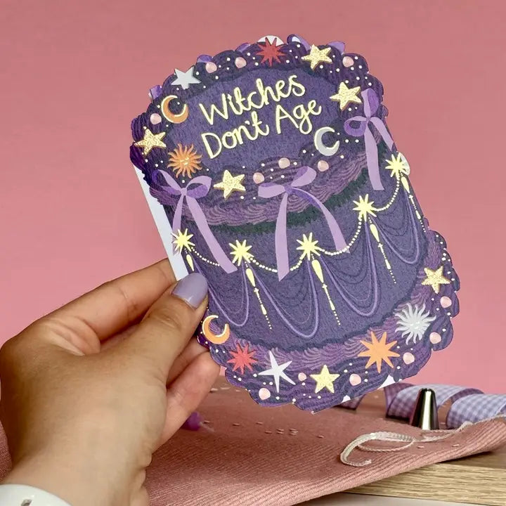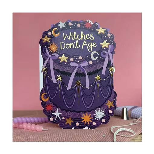 With sparkly stars and 'Witches Don't Age' text highlighted in gold foil, this purple cake shaped birthday card is perfect to celebrate any witch's birthday. It's one of Two for Joy Illustration's delicious range of cake shaped cards.